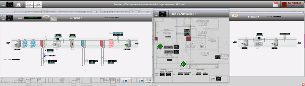 Интерфейс диспетчера построен на параллельно открывающихся окнах: можно одновременно открыть несколько панелей, например, приточку и вытяжку, и наглядно видеть температуры каждой системы в реальном времени. По каждой вентиляционной установке доступны исторические тренды: температура воздуха, положение клапанов, состояние оборудования за любой выбранный период. Графика частично построена на стандартных элементах библиотеки MasterSCADA 4D (вентиляторы, заслонки…), а остальные специфические элементы схем команда разработала самостоятельно в виде SVG-примитивов.