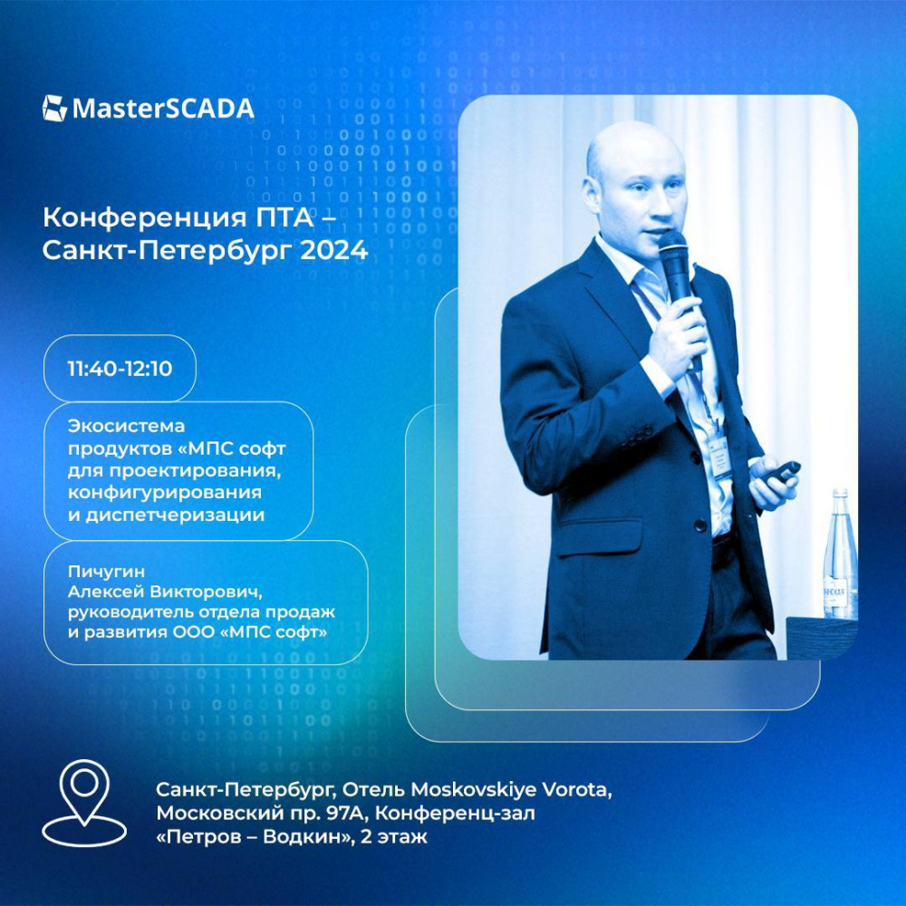Спикер Пичугин Алексей Викторович – руководитель отдела продаж и развития ООО «МПС софт» представит доклад на тему: «Экосистема продуктов «МПС софт» для проектирования, конфигурирования и диспетчеризации».