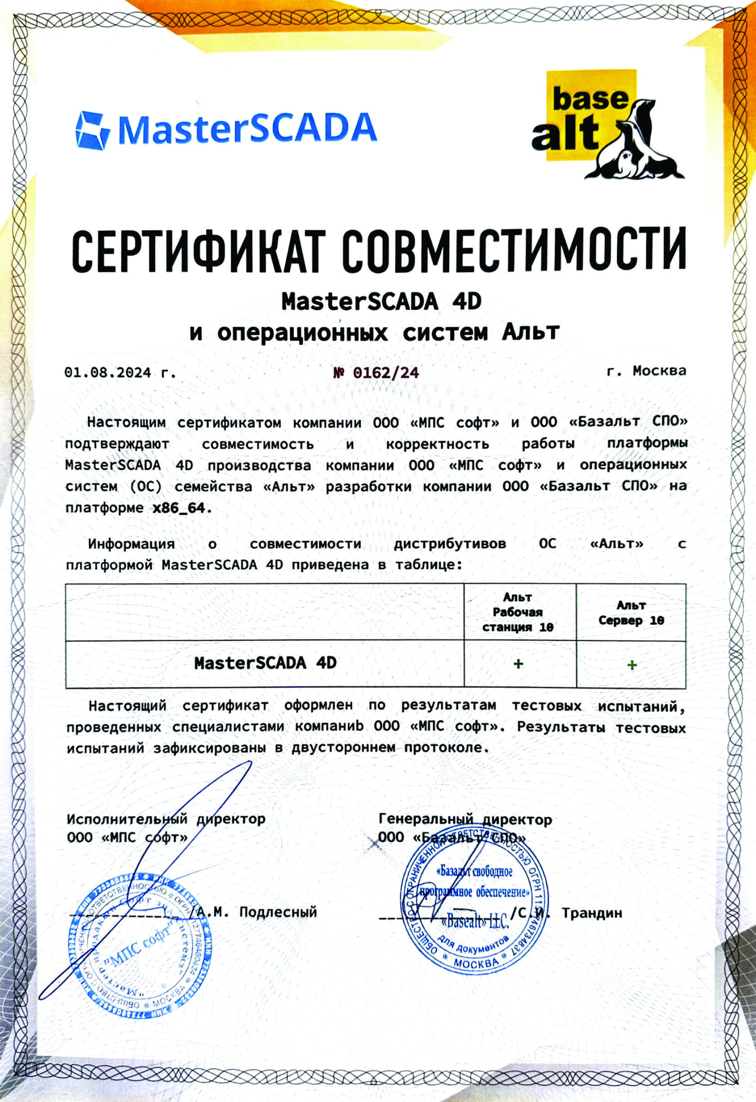 По результатам тестирования подписан сертификат совместимости, подтверждающий корректность работы продуктов на аппаратной платформе х86_64.
