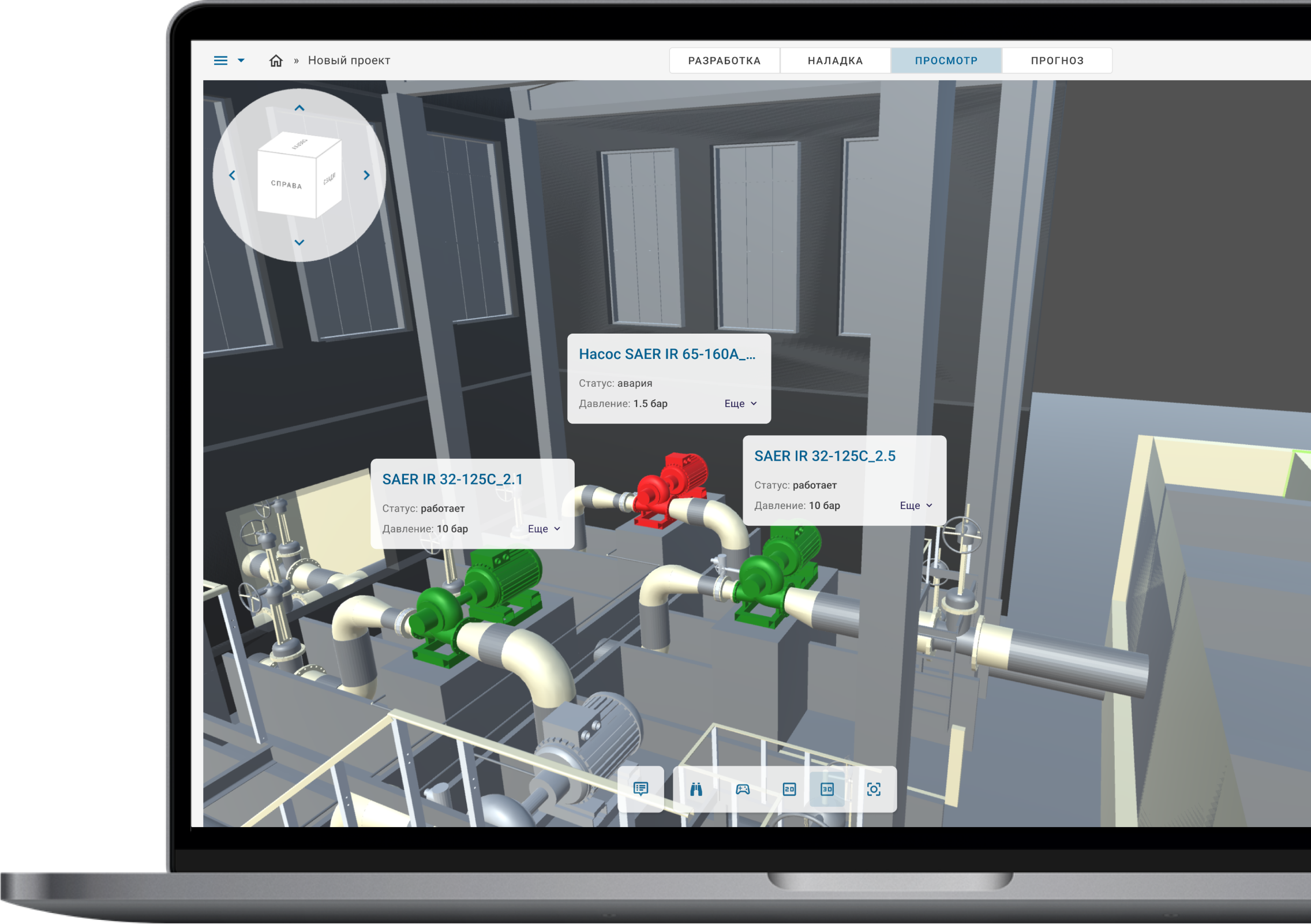 - Возможность осмотреть оборудование со всех сторон, а также переключаться на плоский план
